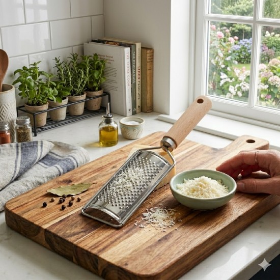 Ergonomik Doğal Ahşap Sap: Açık renkli ahşaptan üretilmiş kalın ve pürüzsüz sapı sayesinde ele tam oturur. Rendeleme işlemi sırasında elden kaymayı önleyerek güvenli ve yormayan bir tutuş sağlar. Mutfağa rustik ve sıcak bir hava katar.