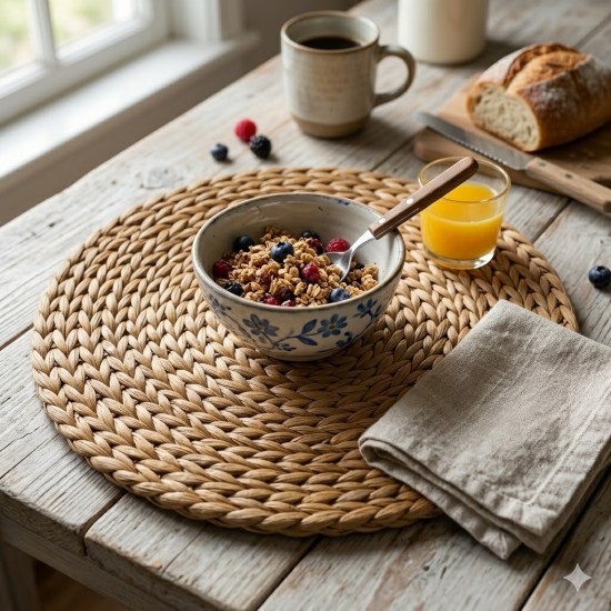 Doğal ve Organik Estetik: Sürdürülebilir doğal liflerden üretilen hasır dokusu, sofranıza sıcak ve samimi bir atmosfer katar. Rustik, Bohem veya İskandinav tarzı dekorasyonlar için vazgeçilmez bir tamamlayıcıdır.